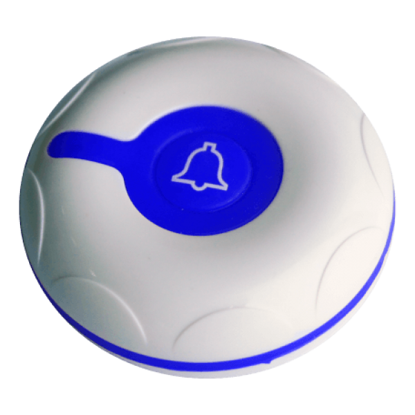 Die drahtlose Ruftaste YK500-1N-B arbeitet über Funkfrequenz und ist wasserdicht, daher auch für den Außenbereich geeignet. Sie wird mit einem Klebe-Pad auf der Rückseite befestigt.